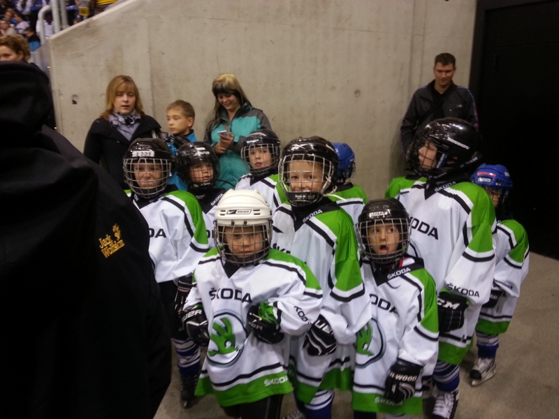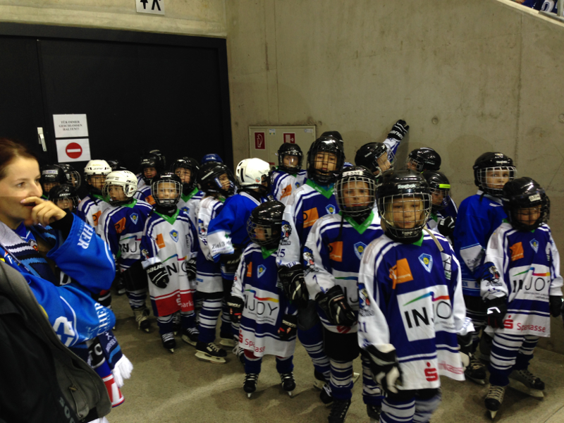 Also runter in die Kabine, Brustpanzer und Protectoren angelegt, Helm und Handschuhe übergestreift, die Schlittschuhe geschnürt, Trikot beim Mannschaftsleiter abgeholt und eh man sich versah scharrten unsere kleinen Helden schon an der Eisfläche mit den Kufen, um nach der Aufwärmung der Großen die Pucks einzusammeln. Dies war natürlich keine Herausforderung für einen Eislöwen, trotzdem noch mal kurz durchschnaufen während die Eismaschine ihrer Bestimmung nachgeht und sich langsam aber sicher die Ränge füllen. Und dann ist der Moment gekommen: Die Fans in der Nordkurve singen, die Einlaufmusik erklingt und unter dem Applaus der über 2600 Zuschauer geht es raus auf's Eis, zwei Runden an der Bande entlang und dann Aufstellung nehmen zum Spalier beim Einlauf der ersten Mannschaft.