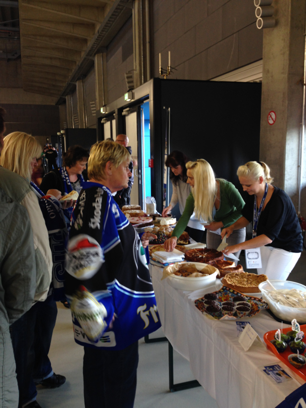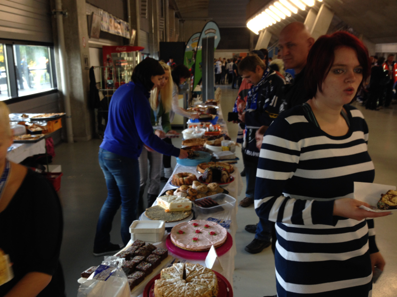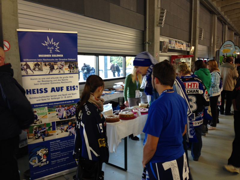 Schon weit vor dem ersten Bully des Spiels der Dresdner Eislöwen gegen die Heilbronner Falken herrschte rege Betriebsamkeit unter den Laufschülern, ihren Eltern, Trainern und Mannschaftsleitern. Die Eislöwen hatten den Spieltag zum Familientag erklärt und traditionell unterstützt der Nachwuchs des Eissportclubs ein solches Ereignis mit einem Kuchenbasar. So wurden die Rezeptbücher mit Omas geheimen Backanleitungen hervorgekramt, gerührt und geknetet, ausgerollt und gebacken, verziert und dekoriert, Tische wurden zusammengerückt und sagenhafte 33 (in Worten: dreiundreißig!!!) feinste Backwaren darauf angerichtet. Dann überliess man den Muttis die Kuchentheke und besann sich wieder auf die eigene Kernkompetenz: On Ice Action.