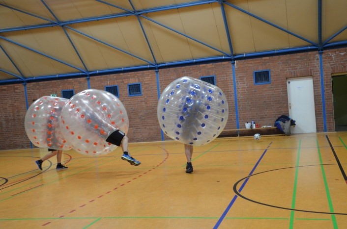 Und so trafen wir uns am 31. Januar 2017 in der Turnhalle auf der Gottfried-Keller Strasse (vielen Dank für die Location liebe Berit!) und harrten der Dinge, die da kommen. Der Anfang war total einfach, wie immer eigentlich. Klamotten ausziehen, in die Sportsachen rein, Turnschuhe an und ab in die Halle. Alles ein bisschen umgeräumt, Tore aufgebaut, „Sicherheitszonen“ geschaffen, 4 Mannschaften gebildet und ein Ball war auch schon da. Nun kamen da noch 2 Fremde dazu. Das waren wohl die Leute die dafür sorgen sollten, dass es etwas Verrücktes, Außergewöhnliches, Besonderes wird. Es wurden noch einmal Bälle ausgepackt, 10 Stück insgesamt, zum Aufblasen und vor Allem riesengroß. Was wird das jetzt!? Unsere Trainer riefen zur Besprechung zusammen und die beiden Fremden zeigten uns, wie man so einen Riesenball „anzieht“. Wir haben den Sinn und das Procedere schnell verstanden und konnten es jetzt kaum noch erwarten, dass es endlich losgeht.