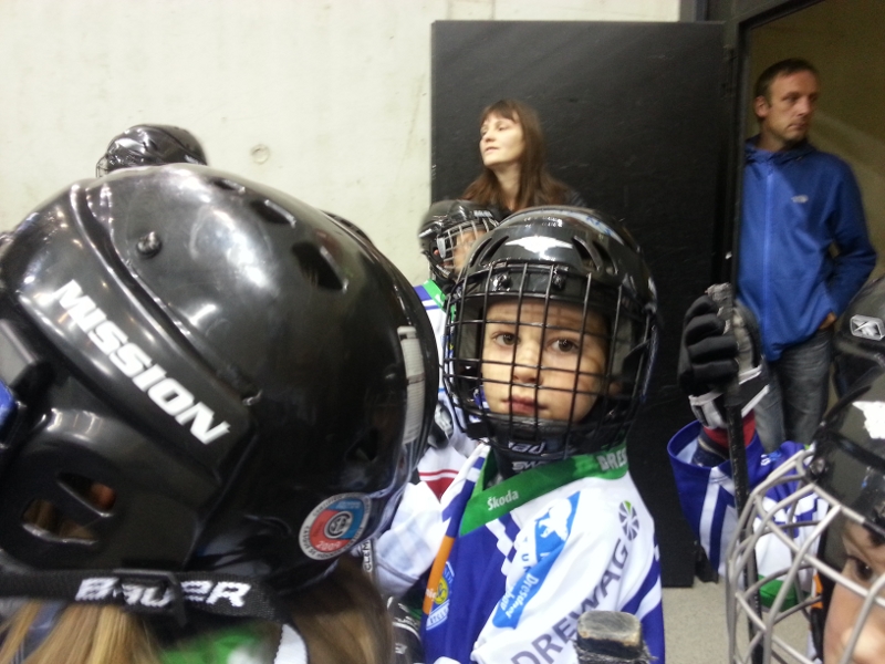 Also runter in die Kabine, Brustpanzer und Protectoren angelegt, Helm und Handschuhe übergestreift, die Schlittschuhe geschnürt, Trikot beim Mannschaftsleiter abgeholt und eh man sich versah scharrten unsere kleinen Helden schon an der Eisfläche mit den Kufen, um nach der Aufwärmung der Großen die Pucks einzusammeln. Dies war natürlich keine Herausforderung für einen Eislöwen, trotzdem noch mal kurz durchschnaufen während die Eismaschine ihrer Bestimmung nachgeht und sich langsam aber sicher die Ränge füllen. Und dann ist der Moment gekommen: Die Fans in der Nordkurve singen, die Einlaufmusik erklingt und unter dem Applaus der über 2600 Zuschauer geht es raus auf's Eis, zwei Runden an der Bande entlang und dann Aufstellung nehmen zum Spalier beim Einlauf der ersten Mannschaft.