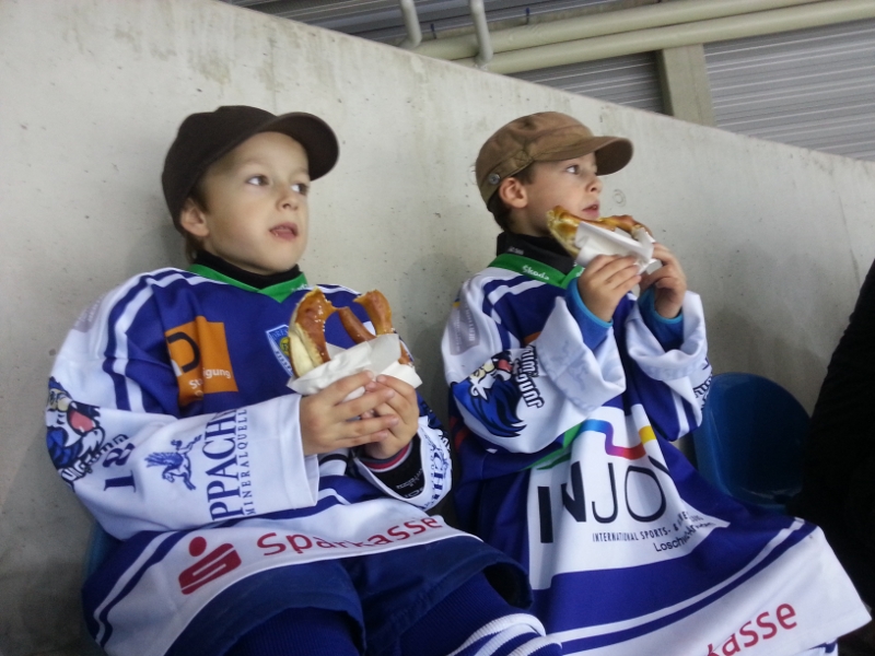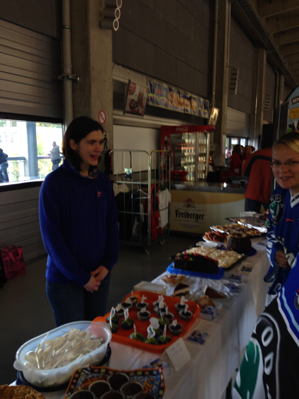 Schon weit vor dem ersten Bully des Spiels der Dresdner Eislöwen gegen die Heilbronner Falken herrschte rege Betriebsamkeit unter den Laufschülern, ihren Eltern, Trainern und Mannschaftsleitern. Die Eislöwen hatten den Spieltag zum Familientag erklärt und traditionell unterstützt der Nachwuchs des Eissportclubs ein solches Ereignis mit einem Kuchenbasar. So wurden die Rezeptbücher mit Omas geheimen Backanleitungen hervorgekramt, gerührt und geknetet, ausgerollt und gebacken, verziert und dekoriert, Tische wurden zusammengerückt und sagenhafte 33 (in Worten: dreiundreißig!!!) feinste Backwaren darauf angerichtet. Dann überliess man den Muttis die Kuchentheke und besann sich wieder auf die eigene Kernkompetenz: On Ice Action.