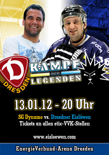Mitte April vor 3 Jahren gab es das erste große Eishockey-Spektakel zwischen einstigen Spielern von Dynamo und Eislöwen. Damals initiiert durch den „Chef“ des Dresdner Fußball-Museum Jens Genschmar in Zusammenarbeit mit der Präsidentin des ESCD Barbara Lässig. Seitens des „Eislöwen“-Teams wurde eine gemischte Mannschaft formiert. Sie bestand aus Aktiven der Profi-Mannschaft, der ALTLÖWEN-Traditionsmannschaft sowie Spielern des Sachsenliga-Teams u. der Dresdner „Frösche“. Die Fußballer um Ulf Kirsten, Ralf Minge, Renè Beuchel u. Ansgar Brinkmann erhielten seinerzeit tatkräftige Unterstützung durch namhafte Kufencracks, wie Mirco Lüdemann, Dieter Frenzel, Jens Ziesche, Stefan Mann und Guido Hiller.