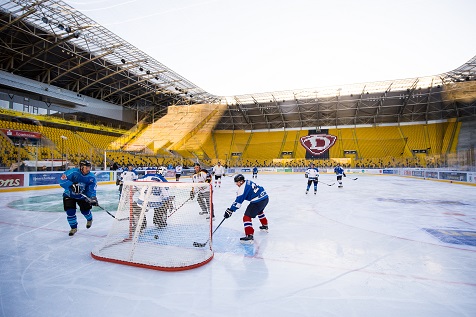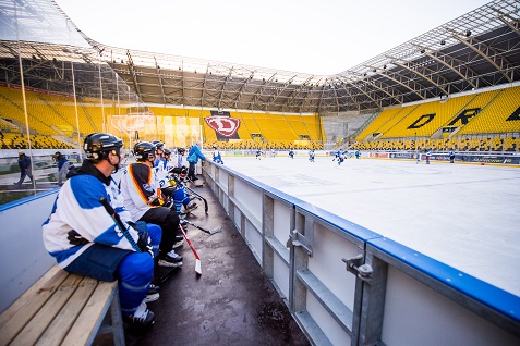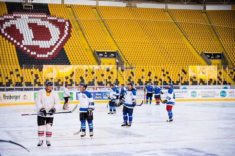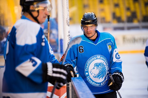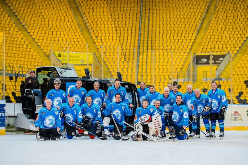 Natürlich kribbelte es den Spielern der Traditionsmannschaft in den Schlittschuhen, einmal die Eisfläche in dem neuentstandenen, außergewöhnlichen Freiluftstadion zu betreten und ein paar Pucks in die Tore zu schießen. Eine ganz große Besonderheit bestand zudem darin, dass vor dem Krieg und in den 50-er Jahren an der Lennèstraße die Dresdner Eisstadien standen! Vor 1945 neben der sogenannten Ilgen-Kampfbahn, ab 1952 im neuerbauten Rudolf-Harbig-Eisstadion neben dem gleichnamigen Fußball- und Leichtathletik-Stadion. 10.000 Zuschauer fanden darin Platz! „Dresden erhält das schönste Eisstadion der Republik“ titelte seinerzeit die Presse. Jetzt hatten wir wieder im Osten Deutschlands für einige Tage das schönstes Eisstadion. Vor dem Krieg spielte die Dresdner Spitzenmannschaft unter der Flagge von „Blau-Weiß“. Unter diesem Namen erreichte sie zweimal die gesamtdeutsche Meisterschafts-Endrunde 1934 (Schierke) und 1938 (Nürnberg). Bis in diese Zeit führen die Spuren unserer heutigen Klubfarben zurück !