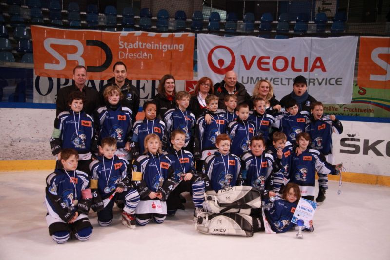 Der Auftritt der Bambini des ESC Dresden am Wochenende war definitiv nichts für schwache Nerven und sorgte für einen Spannungsbogen bei Trainer und Eltern. Nach 3 schlechten Leistungen gegen Iserlohn, Kassel und Decin schien die Finalrunde schon in weite Ferne gerückt. Mangelnde Laufbereitschaft, viele individuelle Fehler und taktische Undiszipliniertheiten kosteten die Eislöwen viele Punkte. Erst im letzten Spiel des Tages gegen den ETC Crimmitschau konnten die Dresdner ihr Leistungsvermögen andeuten und durch 2 klare Siege keimte wieder Hoffnung auf das Erreichen der Finalspiele. Durch das sehr ausgeglichene Niveau aller Teilnehmer konnte sich bis auf die Eisbären Berlin in der Vorrunde keine Mannschaft klar absetzen und so zogen die Dresdner als Vorrundenzweiter in die Hauptrunde ein. Dort erwartete man zunächst den ECC Preussen Berlin. Nach einem spannenden Spiel gewannen die Berliner die erste und die Dresdner die zweite Halbzeit. Nach Tag 1 des SRD-Veolia-Cups lagen die Dresdner in der Hauptrunde hinter den Eisbären Berlin auf Platz 2. Dahinter lauerten weitere 4 Teams, die das Finale noch erreichen wollten.