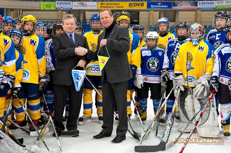 Am vergangenen Samstag erfolgte in der EnergieVerbund-Arena vor über 200 geladenen Gästen aus Sport, Wirtschaft und Politik; vor allem aber auch für zahlreichen Vereinsmitgliedern, aktiven Sportlern samt Eltern und Freunden der offizielle Startschuss für die Kooperation mit dem HC Slovan Ustecti Lvi. Das Projekt „Aus dem Anspielkreis des Eishockey-Spielfelds heraus in die beiden Seiten der Grenze und vielleicht auch weiter ...“ wird durch das Ziel-3-Programm zur Förderung der grenzübergreifenden Zusammenarbeit zwischen dem Freistaat Sachsen und der Tschechischen Republik aus Mitteln des Europäischen Fonds für regionale Entwicklung gefördert. Ziel des Projekts, das im Zeitraum vom 1. Januar 2011 bis zum 30. April 2013 umgesetzt wird, ist, ein Betrag zur Verbesserung der Bedingungen für eine nachhaltige Sportentwicklung im gemeinsamen Grenzraum zu leisten. Die Projektschwerpunkte sind dabei: