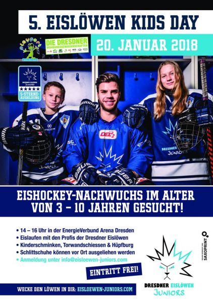 Auch in diesem Jahr steht der Januar bei den Dresdner Eislöwen ganz im Zeichen der Kleinsten. Beim inzwischen 5. EISLÖWEN KIDS DAY am Samstag, 20. Januar 2018 haben alle Kinder im Alter von 3 bis 10 Jahren zwischen 14 und 16 Uhr die Möglichkeit, mit den Spielern, Trainern und dem Maskottchen der Dresdner Eislöwen ein paar Runden auf dem Eis der EnergieVerbund Arena zu drehen.